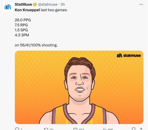 凭借这样的表现,克努佩尔生涯前15场比赛已经命中50记三分,成为NBA历史上达成这一表现最快的球员。