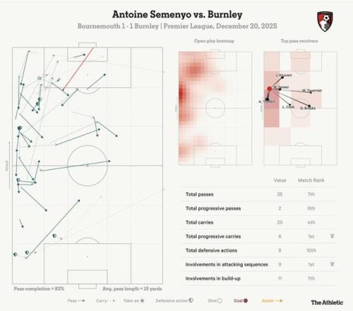 从下面的球员数据面板可以看出,在周六对阵伯恩利的比赛中,塞门约几乎参与了伯恩茅斯前场的所有进攻组织。